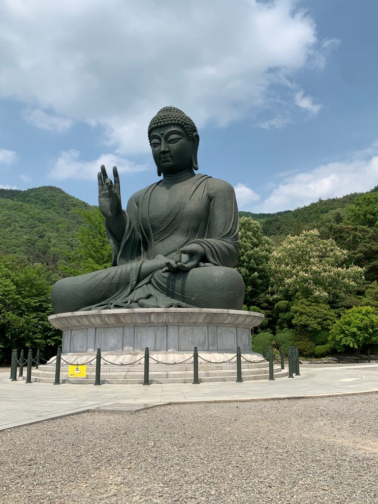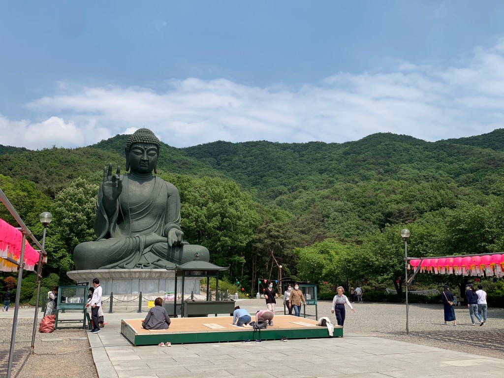 It is home to the largest Buddha statue in all of Korea, it is 15 meters high (about 50 feet) and is 60 tons of bronze. This particular Buddha is Amita-bul, the Buddha of Western Paradise. There is an area in front of the Buddha for people to light candles and place mats down to pray.