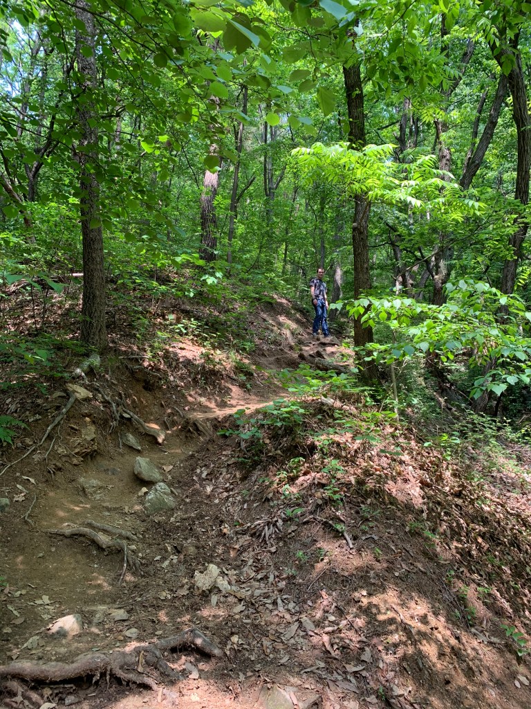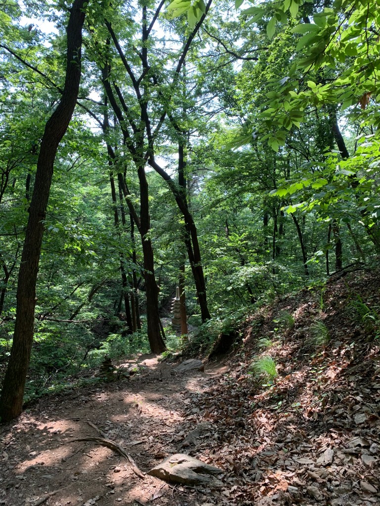 Behind the temple, we went up a small incline and found some nature trails. For those that know me, there is a reason my middle name is not Grace. I inherited my mother’s gracefulness which means I have none. The amount of times I have fallen and sprained or twisted my knees or ankles is unreal, probably close to about two or three times a year, and that is only since being with Buddy. Short side story to explain more, I was wearing tennis shoes on flat ground inside the gym senior year at Union in badminton class. I was literally just walking to the net, tripped over air, and fell twisting my ankle in the process. When I went to get up, my ankle wouldn’t let me put pressure on it. The second time I tried to get up, someone grabbed my left hand to help me up, and I yelled out in pain. A couple of hours later and several x-rays later, not only had I twisted my ankle when I fell, I broke my elbow in 3 places (which included having a small bone flip 180 degrees) and tore a ligament and tendon. That was on a Thursday morning, and the very next Monday I had surgery to put screws in my elbow. So, naturally, I am apprehensive at doing certain activities where I feel like I might fall.