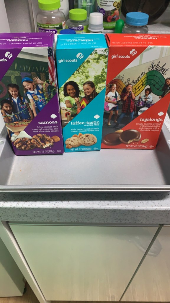 This past Friday, Girl Scouts started selling their cookies on base. So of course, I went as soon as they started selling. I love Samoas, Buddy loves Tagalongs, and I got a box of the Toffee cookies because Buddy loves everything toffee. It made me so happy to see the colorful boxes.