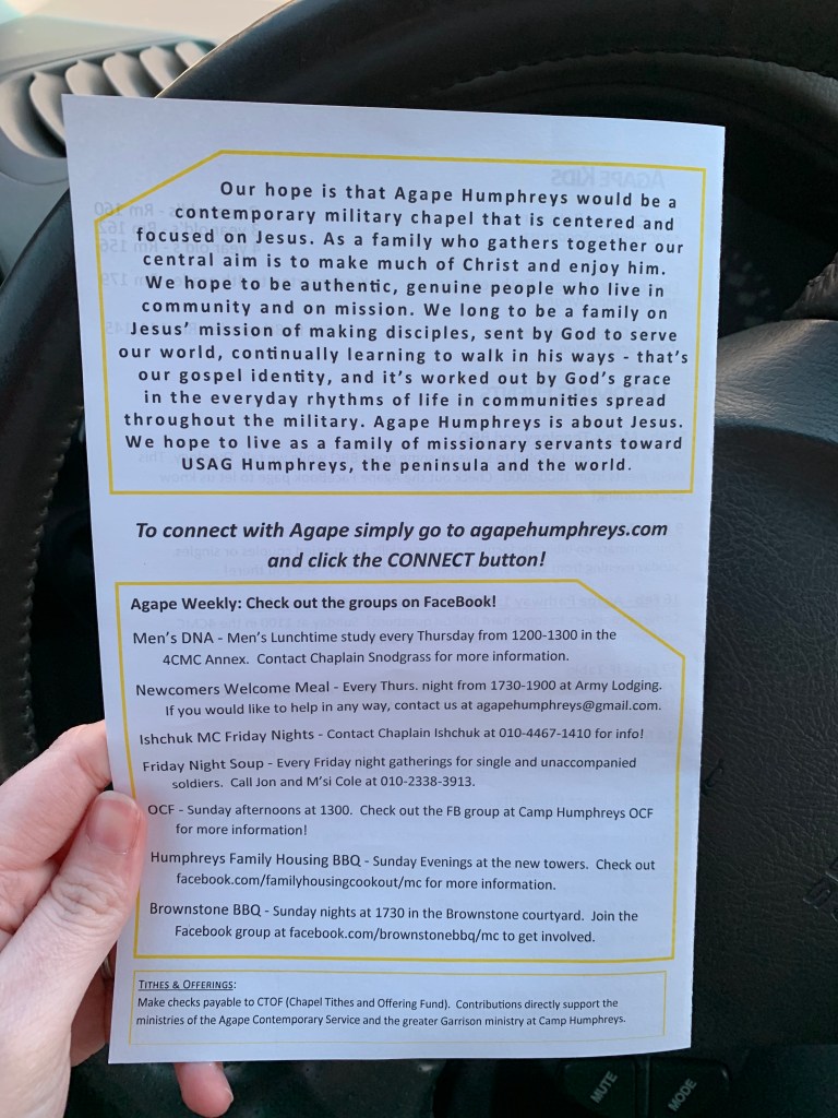 Sunday morning, the boys and I got up and went to church on base. The church is called Agape Humphreys, and it is at the Four Chaplains Memorial Chapel. Even though all three of us grew up in a very traditional type of church setting, I decided to go to this service because of the church Buddy and I went to when we lived in Clarksville. The church mom and I went to when I was growing up consisted of fewer than 50 people attending, and that was on a good day. Mom and I were also the youngest people there, but I loved that church. Our last Sunday there was the Easter service my freshman year of college because there were not enough church members left there to keep the church going. But we sang every Sunday out of the good ole Southern Baptist hymnal with an amazing pianist. Even when I went to Union and tried finding a new church home in Jackson, I kept going to the more traditional services because contemporary was something that I saw good just for chapel services at school. When we moved to Clarksville though, we found LifePoint church. This church is huge, with stadium seating, and is very contemporary. The first Sunday we went though, we both felt immediately at home and like Pastor Mike made that sermon just for us. Once I figured out I had a classmate from Austin Peay go there too, we began sitting with her, which put us on the very front row. But I have never seen a church more on fire for the Lord than that church, and you could feel it in the air. I love that church. I still listen to Pastor Mike’s sermons through their app from time to time. People in that church also helped me get through some really hard and difficult times. I would move back to Clarksville just to be able to attend that church. All of that to say, LifePoint changed my mind about contemporary churches. I enjoyed the service on Sunday, but it will take some getting used to. I do think we are going to give the Traditional service, called Common Grounds, a visit this upcoming Sunday though. Anton kept asking me where all the hymnals were this past Sunday, since Agape uses projection screens. So we’ll see how that goes!